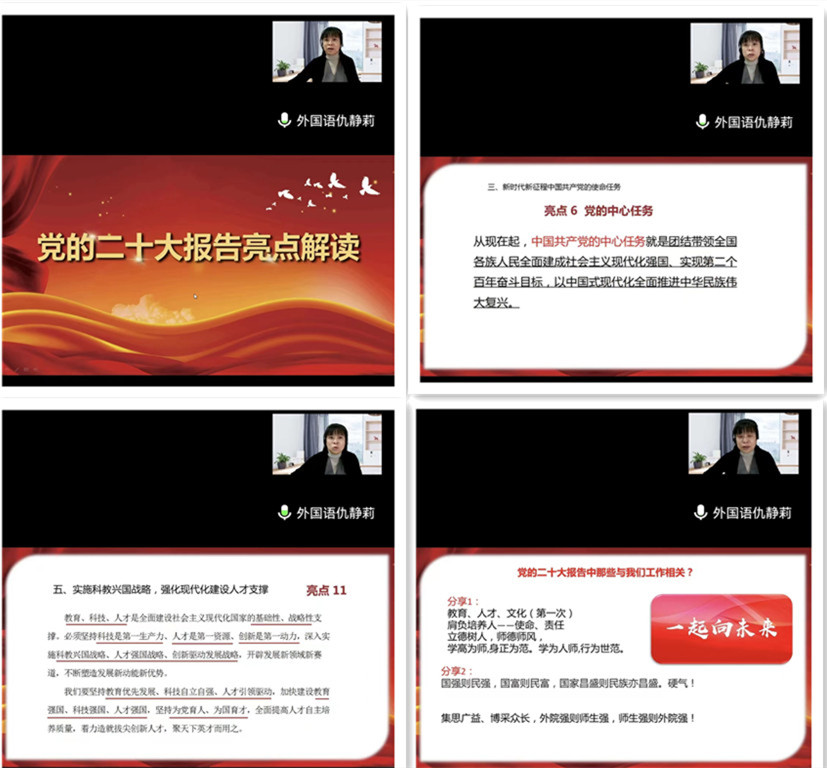 为全面深入学习贯彻党的二十大精神,2022年11月10日,beat365亚洲版官方网站召开线上学习贯彻党的二十大精神宣讲报告会,学院党委书记仇静莉作党的二十大精神宣讲报告,全体教职工参加了大会。