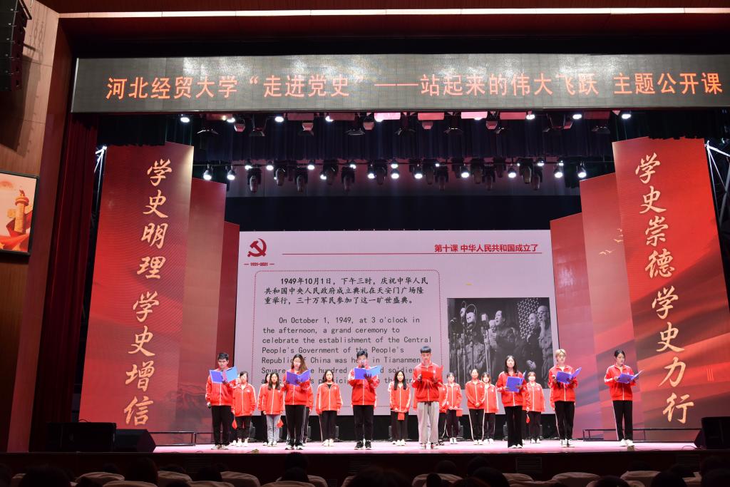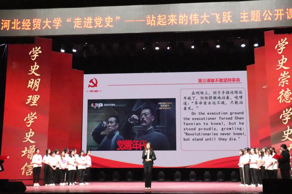 公开课由beat365亚洲版官方网站学生党支部书记李维婷,教师贾春晓、郭朝云、韩智巍主持。此次公开课以建党100周年为契机,将1921年中国共产党建党至1949年中华人民共和国成立,28年艰苦卓绝的奋斗历程浓缩成十个章节,分别为:其作始也简的大事变 、大革命的高潮、敢不敢坚持革命、农村包围城市、敌后战场的开辟与发展、夺取抗日战争的伟大胜利、重庆谈判、千里跃进大别山、抓住有利时机进行三大战役、中华人民共和国成立了。涵盖了实现站起来的伟大飞跃过程中重要时间节点、历史事件、革命思想与伟大精神。一段段历史鲜活的呈现出来:跟随同学们生动的情景剧踏上嘉兴南湖的红船,见证中国共产党的产生与壮大;在慷慨激昂的朗诵中感悟一个个中国共产党人坚定的信念,势必要将革命坚持到底;在嘹亮的歌曲《国家》中点亮星星之火,大胆选择农村包围城市,武装夺取政权——这条前人没有走过的道路;在《沁园春•雪》的深情朗诵中充分展现重庆谈判时中国共产党坚持和平、民主、团结的主张;随着对三大战役的深情讴歌,七届二中全会的胜利召开,为新中国绘制了蓝图,1949年10月1日,中国向世界宣告,中华人民共和国成立了!课程最后《歌唱祖国》熟悉的旋律响起,台上台下师生共同合唱,“五星红旗迎风飘扬,胜利歌声多么嘹亮。歌唱我们亲爱的祖国,从今走向繁荣富强……”,既唱出了每个中华儿女对祖国走向繁荣富强的骄傲,又唱出了对祖国母亲的赞美以及高度的自信,进一步激发了现场师生的爱国、爱党热情,将整堂课程推向高潮。