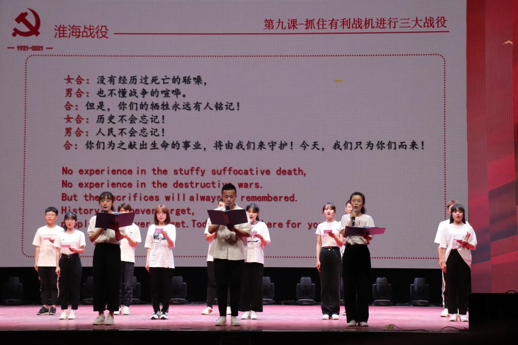 本次主题公开课充分发挥外语专业优势,通过中英双语为同学们生动的讲述党史故事。十个章节的讲解采用反转课堂的形式,将课程任务分配给一、二年级十个英语专业班级,各班学生群策群力,集体备课,搜集党史资料,全程全员参与讲述党的历史,课程讲解过程中穿插同学们精心剪辑的视频、热情饱满的歌曲、经典影视配音、情景剧、诗朗诵等形式,将中国共产党由弱到强,为争取民族独立、人民解放而不懈拼搏奋斗的精神和勇气展现在全体师生面前,具有很强的代入感,最大程度产生心灵共鸣。