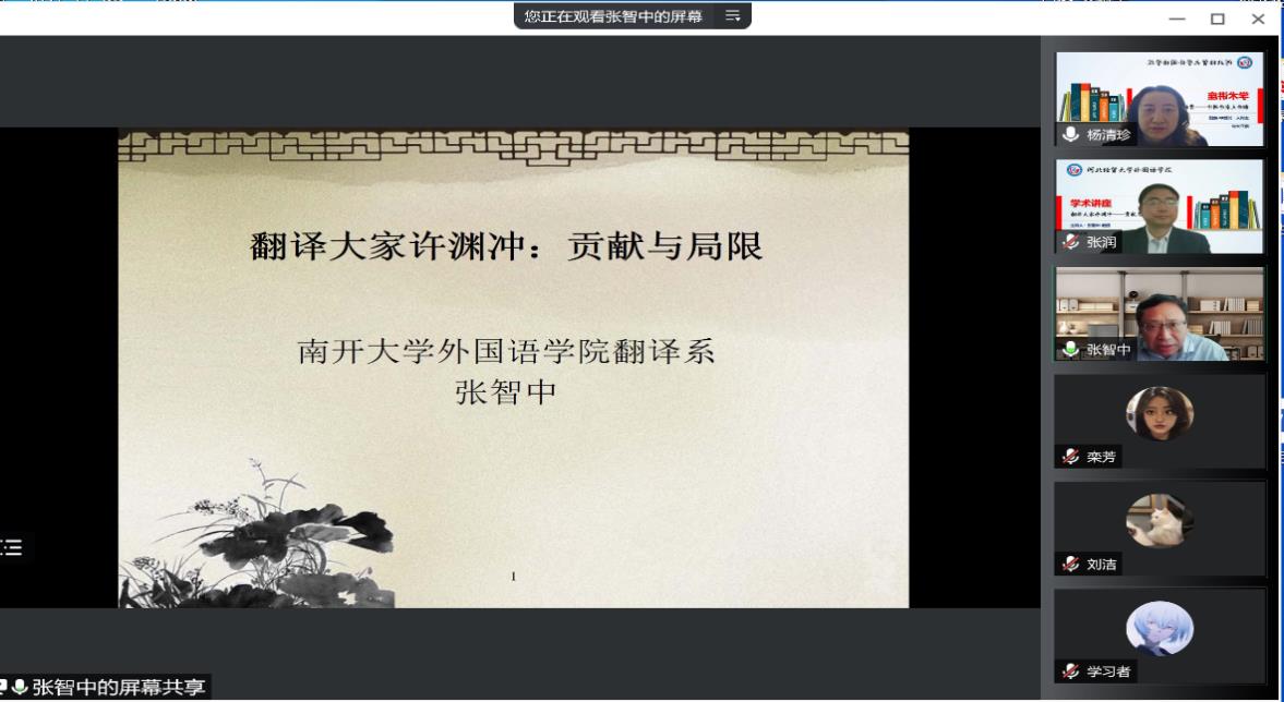 5月13日下午,应beat365亚洲版官方网站邀请,南开大学beat365亚洲版官方网站博士生导师、翻译系主任张智中教授为beat365官网师生做线上专题讲座。讲座由杨清珍副院长主持,张润院长出席并对讲座进行了总结发言,beat365亚洲版官方网站全体研究生、部分教师和本科生近60人参加了本次讲座。