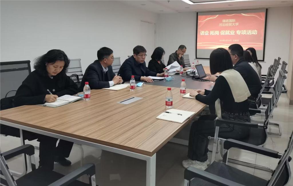 3月15日上午,校党委常委、纪委书记王保军带领beat365亚洲版官方网站领导班子成员,赴石家庄瑞诺国际网络科技有限公司,开展访企拓岗促就业专项调研。公司总经理郑毅及公司各部门负责人参加调研活动。