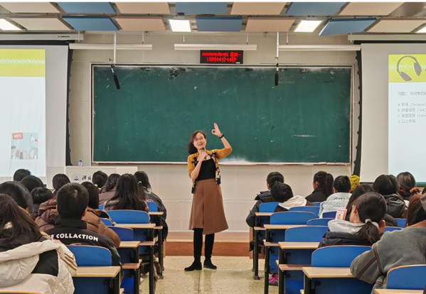 讲座过程中,周老师采用互动方式,通过列举与英语学习紧密相关的常见场景,如“备考专四时单词记忆困难”、“听力练习时容易分心”等,引导同学们根据自身情况做出回应。这一互动环节有效激发了同学们的兴趣,现场氛围热烈,同学们积极参与,展现了较高的学习热情。